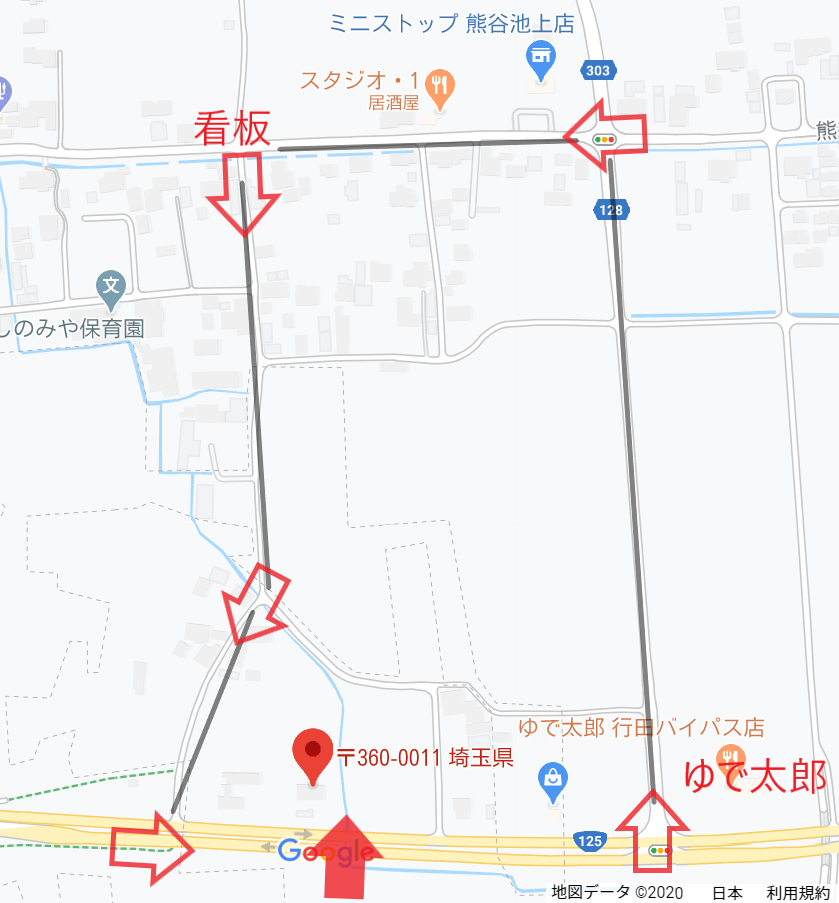 しかし、125号バイパスを行田・羽生方面からお越しの方、片側2車線のため道路から直接入ることができません。