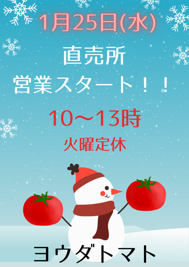 2023年 直売所 営業開始のお知らせ お知らせ 2023.01.18 大変、お待たせしました。 1月25日(水)より直売所の営業を開始いたします。 ご予約、お取り置きなどご遠慮なくご連絡くださいませ。 たくさんのご来店心よりお待ちしております(^▽^)/